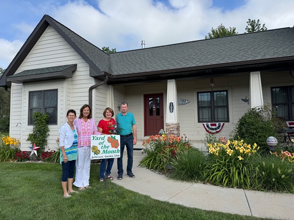Mounds of unique and colorful day lilies offer a bright and cheery welcome to the home of Mark and Gayle Lange, 100 Briarwood Bend, the Jefferson Garden Club’s July Yard of the Month. The couple has traveled to distant garden centers in search of special daylily varieties. The clematis vines which bloom abundantly earlier in the summer are another feature on the east front of the home built in 2011.
