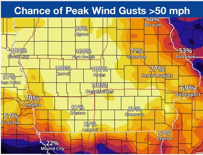 The National Weather Service has issued a winter storm watch for much of northwest and central Iowa. Strong winds with gusts of more than 50 mph are predicted to cause significant blowing and drifting of snow Tuesday night into Wednesday. Significant impacts to the Wednesday morning commute are likely.